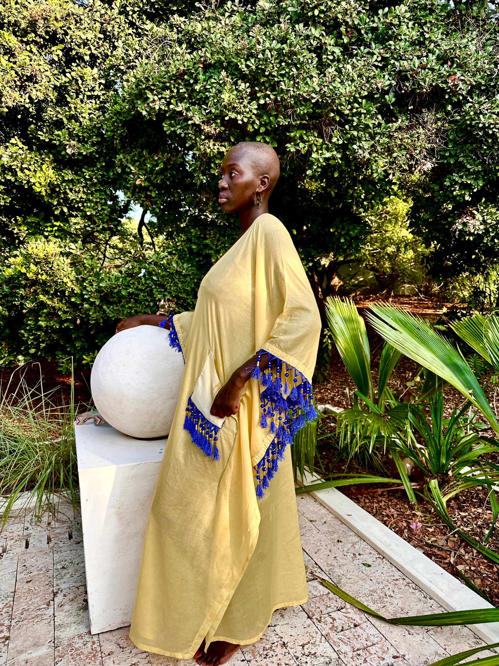 This caftan is designed as a relaxed, free-flowing silhouette and is offered in two thoughtfully graded sizes to ensure a beautiful drape across different body types.