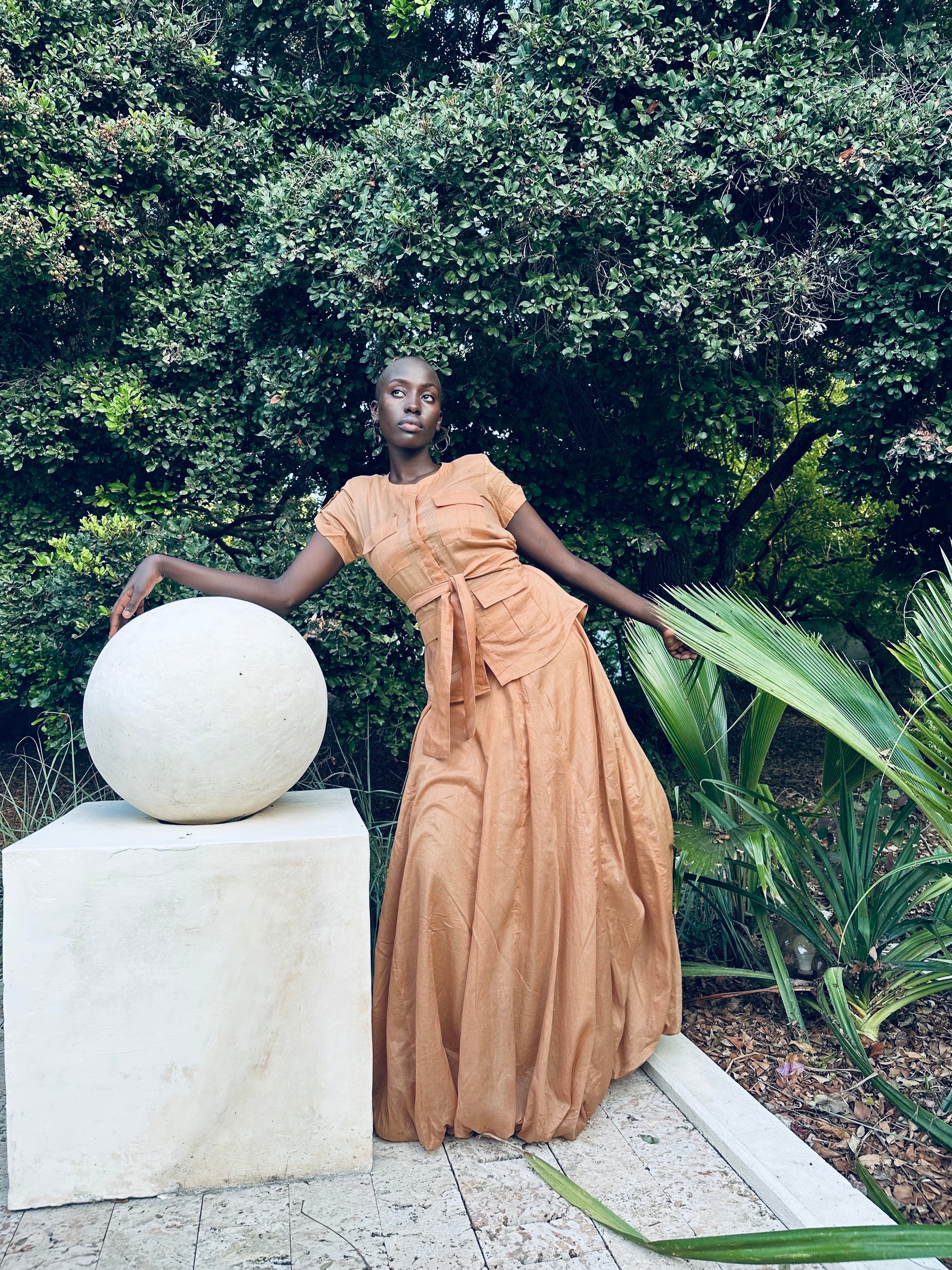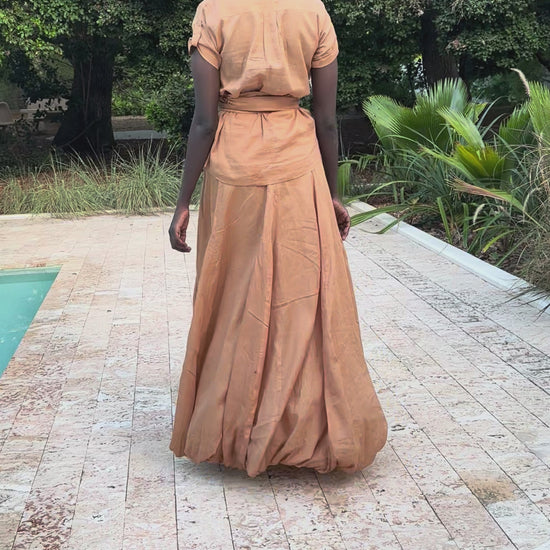 A modern safari-inspired set crafted from 100% cotton voile. Featuring a high-waisted voluminous bubble skirt and a matching top with a soft fabric belt, this lightweight and breezy silhouette is designed for effortless movement and versatility. Wear together for an elevated statement or style each piece on its own.