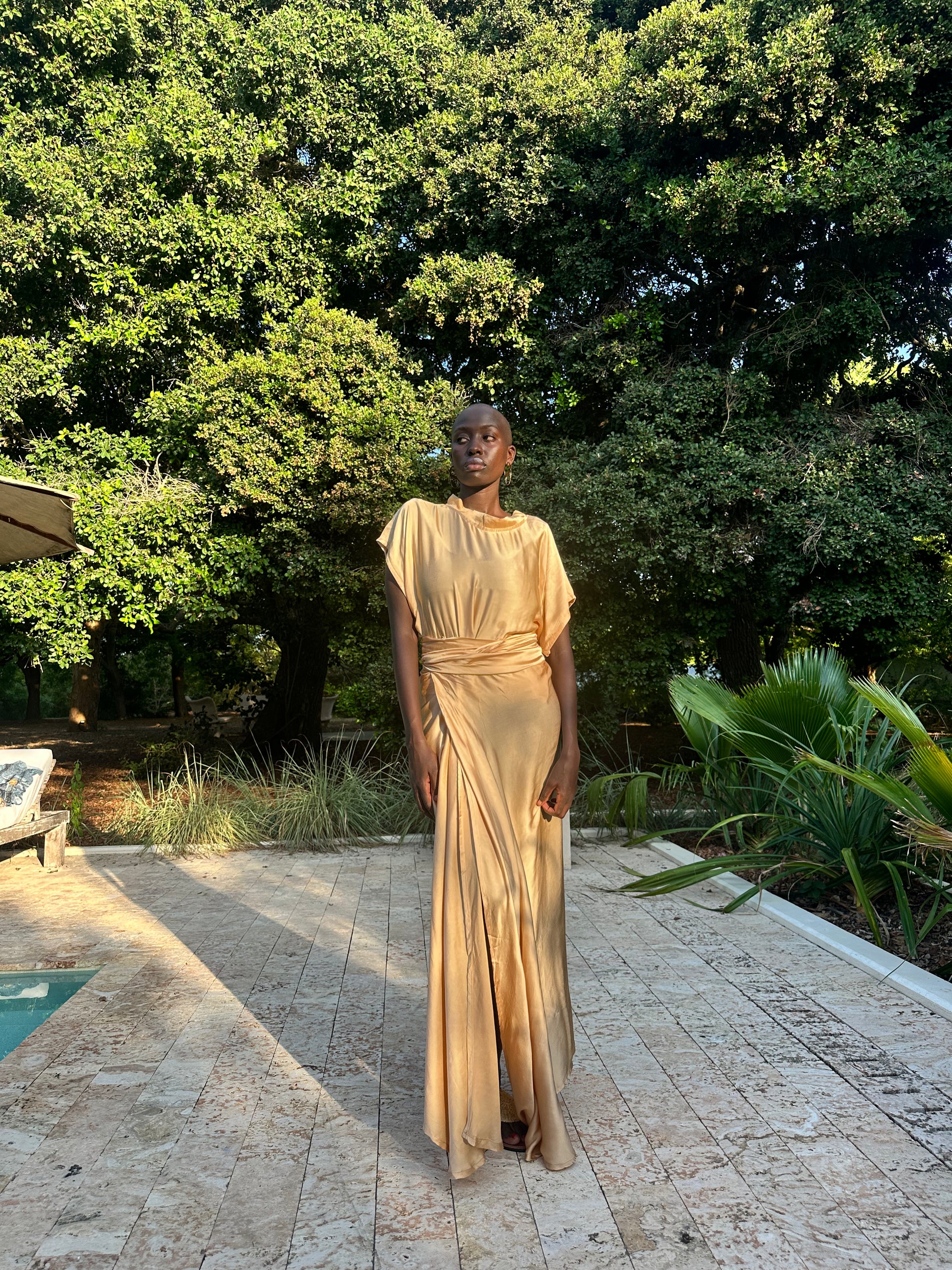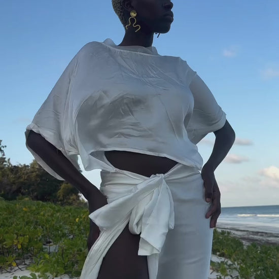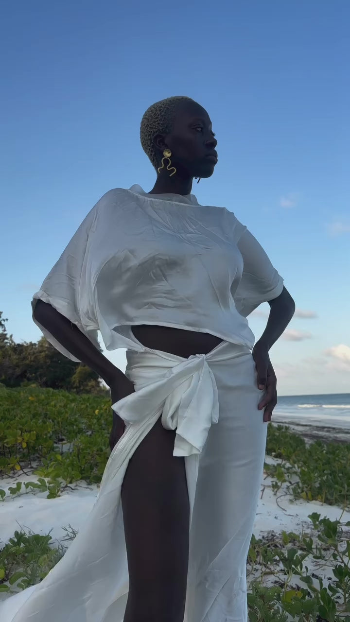Designed for ease, movement, and versatility, this silky wrap dress is cut to skim the body softly while allowing freedom of movement. The wrap-style bottom can be worn open to reveal a leg, or wrapped fully for a more covered, fluid silhouette — making it adaptable to mood, moment, and setting.